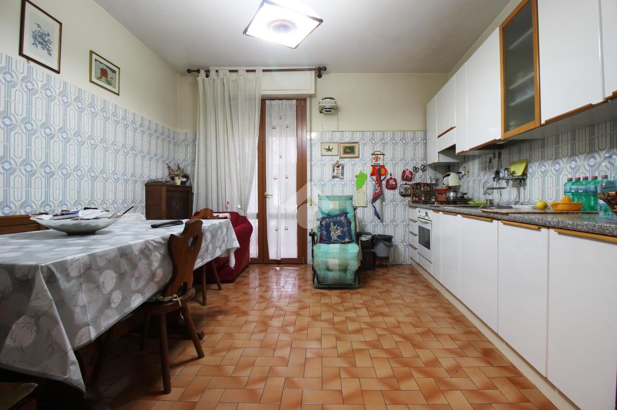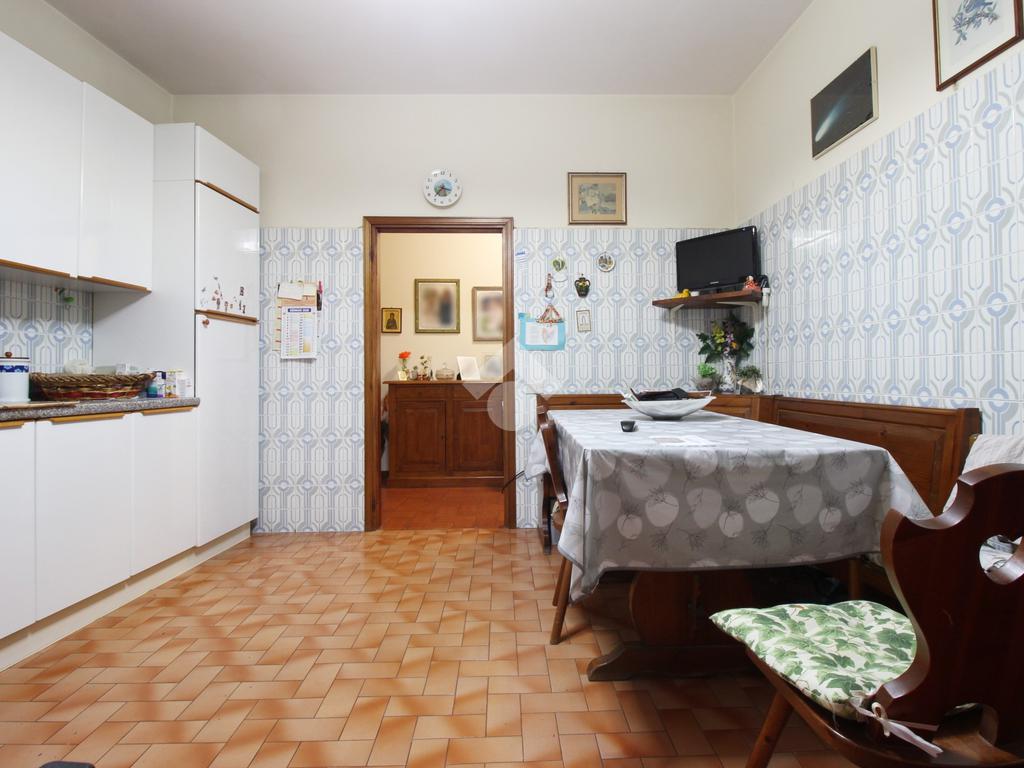 Sulla destra si trova una cucina di ampia metratura, collegata al primo terrazzo con affaccio sul retro, ideale come spazio di servizio.